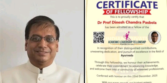 देहरादून: 28 दिसम्बर 2026, रविवार। एसोसिएशन ऑफ इंडियन प्राइवेट यूनिवर्सिटीज (AIPU), गाजियाबाद , उत्तर प्रदेश, भारत द्वारा आयुर्वेद विभाग, उत्तराखंड के दो वरिष्ठ, काबिल एवं अनुभवी आयुर्वेद चिकित्सा अधिकारियों डॉ० प्रो० डी० सी० पसबोला और डॉ० अजय चमोला को “फेलोशिप इन आयुर्वेद (FAIPU)” उपाधि सम्मान प्रदान किया गया है। जिसके डाइरेक्टर, फेलोशिप अफेयर्स – डॉ० सी० वेणुगोपाल राव एवं चीफ एक्जीक्यूटिव आफिसर – डॉ० नवीन अमन्ना हैं