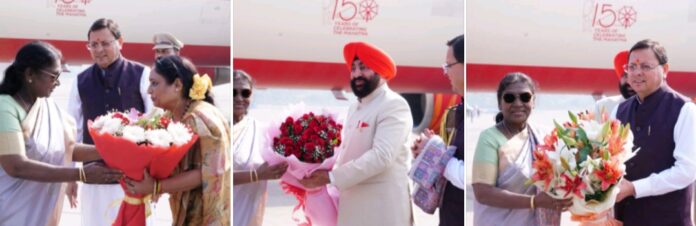 देहरादून 2 नवंबर। राष्ट्रपति श्रीमती द्रौपदी मुर्मु के जौलीग्रांट एयरपोर्ट आगमन पर राज्यपाल लेफ्टिनेंट जनरल गुरमीत सिंह (से नि), मुख्यमंत्री श्री पुष्कर सिंह धामी , विधानसभा अध्यक्ष श्रीमती ऋतु खंडूड़ी भूषण, मंत्रीगणों, विधायकगणों और अन्य जनप्रतिनिधियों ने उनका स्वागत एवं अभिनंदन किया।