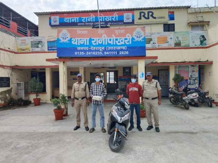 (2) साहिल पुत्र मुराद अली, निवासी ग्राम घमण्डपुर, थाना रानीपोखरी, जनपद देहरादून, उम्र 22 वर्ष।) को चोरी किए गए एक्टिवा वाहन के साथ गिरफ्तार किया गया, जिनके कब्जे से घटना में चोरी किया गया अन्य सामान भी बरामद हुआ।