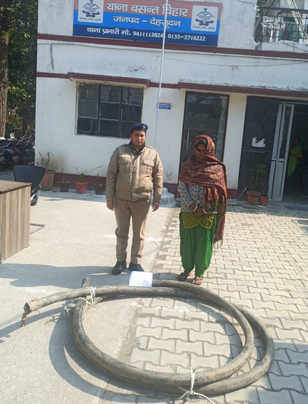 अभियोग के अनावरण हेतु एसएसपी देहरादून के निर्देशों पर थाना बसंत विहार पर पुलिस टीम गठित की गई। गठित टीम द्वारा घटनास्थल का निरीक्षण कर घटनास्थल एवं आसपास लगे सीसीटीवी कैमरो को चैक किया गया तथा सीसीटीवी फुटेजों व मुखबिर की सूचना पर आज दिनाँक 14/02/2026 को घटना में शामिल अभियुक्ता मीना देवी पत्नी दुखी साहनी निवासी ग्राम कल्याणपुर जिला समस्तीपुर बिहार हाल पता कांवली रोड निकट बल्लीवाला चौक, बसंत विहार, देहरादून, उम्र 32 वर्ष को घटना में चोरी किये गए बिजली के तार के साथ वसंत विहार चौक से गिरफ्तार किया गया।