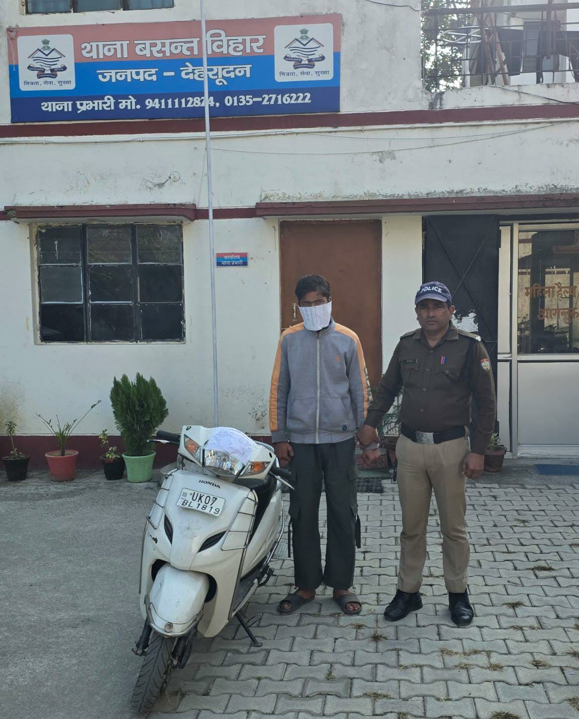 बसंत विहार–देहरादून 22 नवंबर। वादी श्री जितेंद्र कुकरेजा पुत्र श्री पी. एस. कुकरेजा निवासी महारानी बाग फेस सेकंड गणपति अपार्टमेंट द्वारा दिनांक 20-11-25 को थाना बसन्त विहार पर एक लिखित शिकायती प्रार्थना पत्र दिया किया एक अज्ञात चोर द्वारा उनके फ्लैट के नीचे से उनकी स्कूटी संख्या: यू0के0-07-बीएल-1819 रंग सफेद को चोरी कर लिया गया है। प्रार्थना पत्र के आधार पर थाना बसन्त विहार पर मु0अ0सं0: 178/25 धारा 303(2), 317(2) बीएनएस का अभियोग पंजीकृत किया गया।