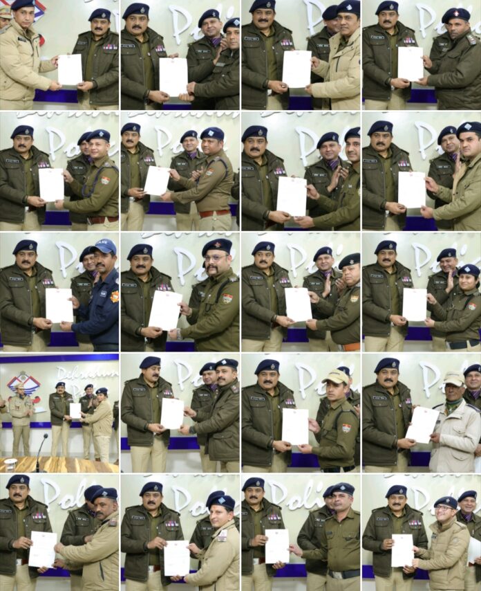 देहरादून 13 जनवरी। आज दिनांक 13-01-2026 को वरिष्ठ पुलिस अधीक्षक देहरादून द्वारा पुलिस कार्यालय देहरादून में पुलिस कर्मियों का सैनिक सम्मेलन लिया गया, सम्मेलन के दौरान एसएसपी देहरादून द्वारा उपस्थित पुलिस कर्मियों से उनकी समस्याओं की जानकारी लेते हुए उपस्थित अधिकारियों को उनके त्वरित निस्तारण के निर्देश दिये गये। गोष्ठी के दौरान एसएसपी देहरादून द्वारा उत्कृष्ठ कार्य करने वाले 101 पुलिस अधि0/कर्म0 को प्रशस्ति पत्र देकर सम्मानित किया गया, साथ ही भविष्य में भी इसी प्रकार अपने कर्त्तव्यों का निर्वहन करने के लिये प्रेरित किया।