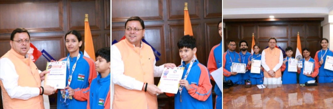 नई दिल्ली 8 जुलाई। मुख्यमंत्री श्री पुष्कर सिंह धामी ने मंगलवार को नई दिल्ली में राज्य के तीन होनहार कराटे चैंपियंस को सम्मानित किया। मुख्यमंत्री ने कहा कि सम्मानित किए जा रहे सभी प्रतिभाशाली खिलाड़ी राज्य के उज्ज्वल भविष्य की नींव हैं। उन्होंने कहा, इन खिलाडियों ने अपनी खेल प्रतिभा से अपने माता-पिता के साथ ही उत्तराखंड का मान भी बढ़ाया है। तीनों खिलाड़ियों अनामिका, मैत्री व क्रियांश ने 5-6 जुलाई 2025 को कोलंबो, श्रीलंका में आयोजित 9वीं साउथ एशियन कराटे चैंपियनशिप में भारत का प्रतिनिधित्व करते हुए रजत, कांस्य व कांस्य पदक जीते है, मुख्यमंत्री ने इन खिलाडियों के उज्जवल भविष्य की कामना की तथा भविष्य के आयोजनों में सफलता के लिये शुभकामनाये भी दी।