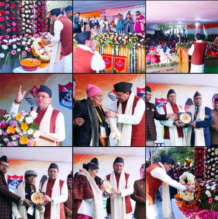 देहरादून 16 दिसंबर। मुख्यमंत्री श्री पुष्कर सिंह धामी ने मंगलवार को विजय दिवस के अवसर पर गांधी पार्क, देहरादून में आयोजित श्रद्धांजलि एवं सम्मान समारोह कार्यक्रम में प्रतिभाग करते हुए शहीद स्मारक पर पुष्पचक्र अर्पित कर वीर बलिदानियों को श्रद्धांजलि दी। इस अवसर पर उन्होंने 1971 के युद्ध के सैनिकों और शहीदों के परिजनों को सम्मानित भी किया। कार्यक्रम में मुख्यमंत्री ने घोषणा की कि सैनिक कल्याण निदेशालय और जिला सैनिक कल्याण कार्यालय (डीडीहाट, हरबर्टपुर, पिथौरागढ़ एवं हरिद्वार) इन सभी पाँच कार्यालयों में सरकारी वाहन दिए जाएंगे।