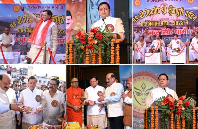 टिहरी 27 अक्टूबर। सोमवार को मुख्यमंत्री श्री पुष्कर सिंह धामी ने जनपद टिहरी गढ़वाल पहुंचकर नौ दिवसीय 49वें श्री कुंजापुरी पर्यटन एवं विकास मेले का ध्वजारोहण कर मेले के शुभारम्भ की घोषणा की। इसके साथ ही उन्होंने विकास प्रर्दशनी का उद्घाटन, विभिन्न विभागों द्वारा स्थापित स्टालों का निरीक्षण तथा अमर शहीदों की मूर्तियों एवं स्वतंत्र संग्राम शहीद स्मारक पर मल्यार्पण किया गया।