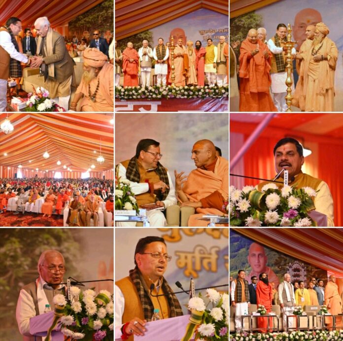 इस अवसर पर मुख्यमंत्री श्री पुष्कर सिंह धामी ने कहा कि सनातन चेतना के जीवंत प्रतीक आप सभी संत-महात्मा, धर्मगुरु एवं श्रद्धालुजन, माँ गंगा के पावन तट पर स्थित सप्तऋषि क्षेत्र में एकत्र होकर राष्ट्र और संस्कृति के लिए अपना अमूल्य योगदान दे रहे हैं। उन्होंने कहा कि जिन महापुरुषों ने अपना सम्पूर्ण जीवन राष्ट्रधर्म, सेवा, त्याग और करुणा के लिए समर्पित किया, वे केवल संन्यासी नहीं बल्कि राष्ट्र चेतना से जुड़े दिव्य संत थे।