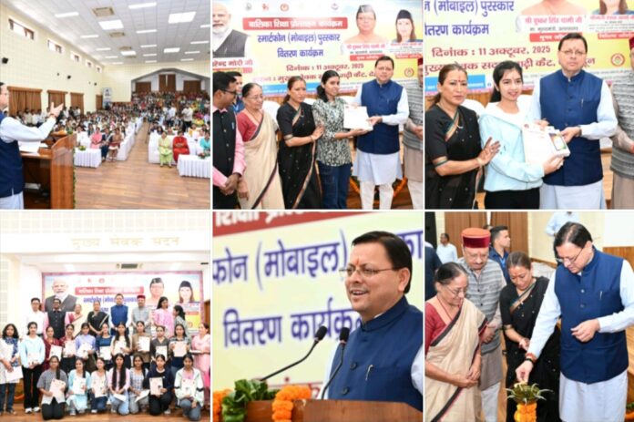 देहरादून 11 अक्टूबर। मुख्यमंत्री श्री पुष्कर सिंह धामी ने शनिवार को मुख्यमंत्री कैम्प कार्यालय स्थित मुख्य सेवक सदन में अंतरराष्ट्रीय बालिका दिवस के अवसर पर आयोजित बालिका शिक्षा प्रोत्साहन कार्यक्रम में प्रतिभाग किया। महिला सशक्तिकरण एवं बाल विकास विभाग द्वारा आयोजित इस कार्यक्रम में 326 मेधावी बालिकाओं को स्मार्टफोन प्रदान किए गए। जनपद स्तर पर हाईस्कूल एवं इंटरमीडिएट की परीक्षा के प्रथम तीन टॉपर बालिकाओं एवं विकासखण्ड स्तर पर टॉपर बालिकाओं को मुख्यमंत्री द्वारा पुरस्कृत किया गया।
