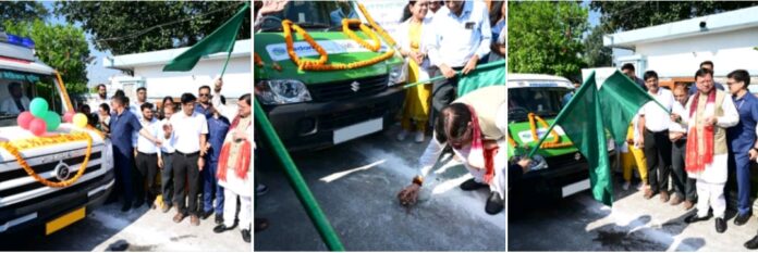 16 अक्टूबर। हंस फाउंडेशन देहरादून के सहयोग से प्रदत्त 08 व हिन्दुस्तान जिंक व ममता संगठन के संयुक्त सौजन्य से 1 मोबाईल स्वास्थ्य सेवा वाहन को मुख्यमंत्री श्री पुष्कर सिंह धामी ने गुरुवार को निजी आवास, नगला तराई खटीमा से हरी झण्डी दिखाकर रवाना किया।