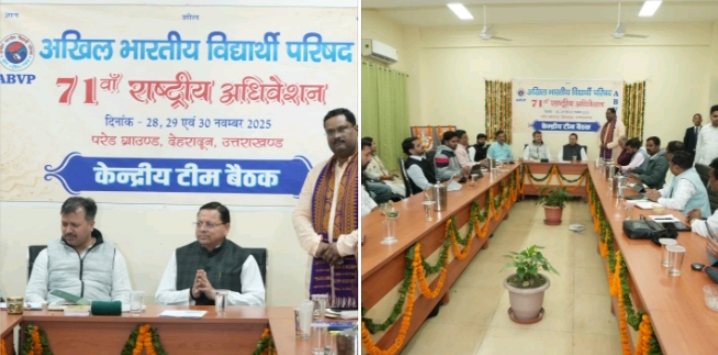 25 अक्तूबर । मुख्यमंत्री श्री पुष्कर सिंह धामी ने आज दून विश्वविद्यालय में अखिल भारतीय विद्यार्थी परिषद (ABVP) के 28 से 30 नवम्बर 2025 को देहरादून में 71वें राष्ट्रीय अधिवेशन के आयोजन से संबंधित केंद्रीय टीम की बैठक में प्रतिभाग किया।