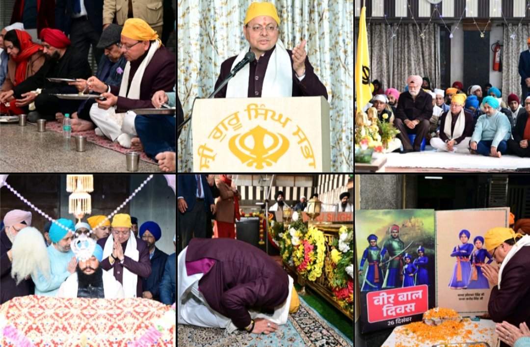 देहरादून 26 दिसंबर। मुख्यमंत्री श्री पुष्कर सिंह धामी ने शुक्रवार को गुरूद्वारा, श्री गुरू सिंह सभा, आढ़त बाजार, देहरादून में वीर बाल दिवस के अवसर पर आयोजित कार्यक्रम में प्रतिभाग किया। इस अवसर पर मुख्यमंत्री ने गुरू सिंह सभा में माथा टेका एवं लंगर ग्रहण किया। मुख्यमंत्री ने संगत के साथ मिलकर पवित्र अरदास की और प्रदेश की सुख-समृद्धि और खुशहाली की कामना की।