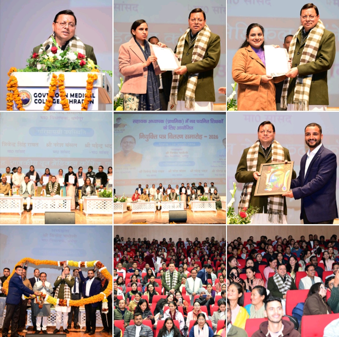 देहरादून 28 जनवरी। मुख्यमंत्री श्री पुष्कर सिंह धामी ने बुधवार को राजकीय दून मेडिकल कॉलेज, पटेलनगर, देहरादून में 1035 सहायक अध्यापक (प्राथमिक शिक्षा) को नियुक्ति पत्र प्रदान किए, जिनमें 17 विशेष शिक्षक भी शामिल हैं। मुख्यमंत्री ने सभी अभ्यर्थियों को शुभकामनाएं देते हुए आशा व्यक्त की कि सभी युवा शिक्षक राज्य में शिक्षा का स्तर बेहतर करने में महत्वपूर्ण भूमिका निभाएंगे। उन्होंने कहा कि आज से आपके कंधों पर उत्तराखंड के भविष्य को संवारने की महत्वपूर्ण जिम्मेदारी आ गई है। जब किसी बच्चे को गुणवत्तापूर्ण और संस्कारयुक्त शिक्षा मिलती है, तो वह केवल अपना जीवन ही नहीं संवारता, बल्कि समाज और राष्ट्र के निर्माण में भी अमूल्य योगदान देता है। शिक्षक देश के उज्ज्वल भविष्य के शिल्पकार हैं।