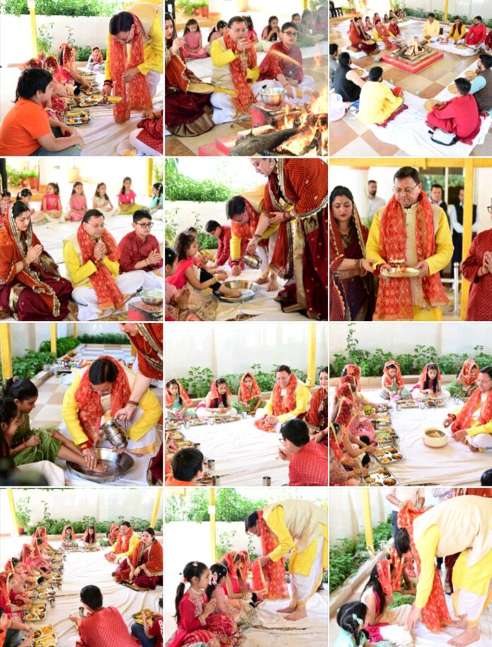 26 मार्च। रामनवमी के शुभ अवसर पर मुख्यमंत्री आवास में मुख्यमंत्री श्री पुष्कर सिंह धामी ने कन्या पूजन कर देवी स्वरूपा बालिकाओं का सम्मान किया। इस दौरान उन्होंने पारंपरिक रीति-रिवाजों के अनुसार कन्याओं को भोजन कराया तथा उनका आशीर्वाद प्राप्त किया।