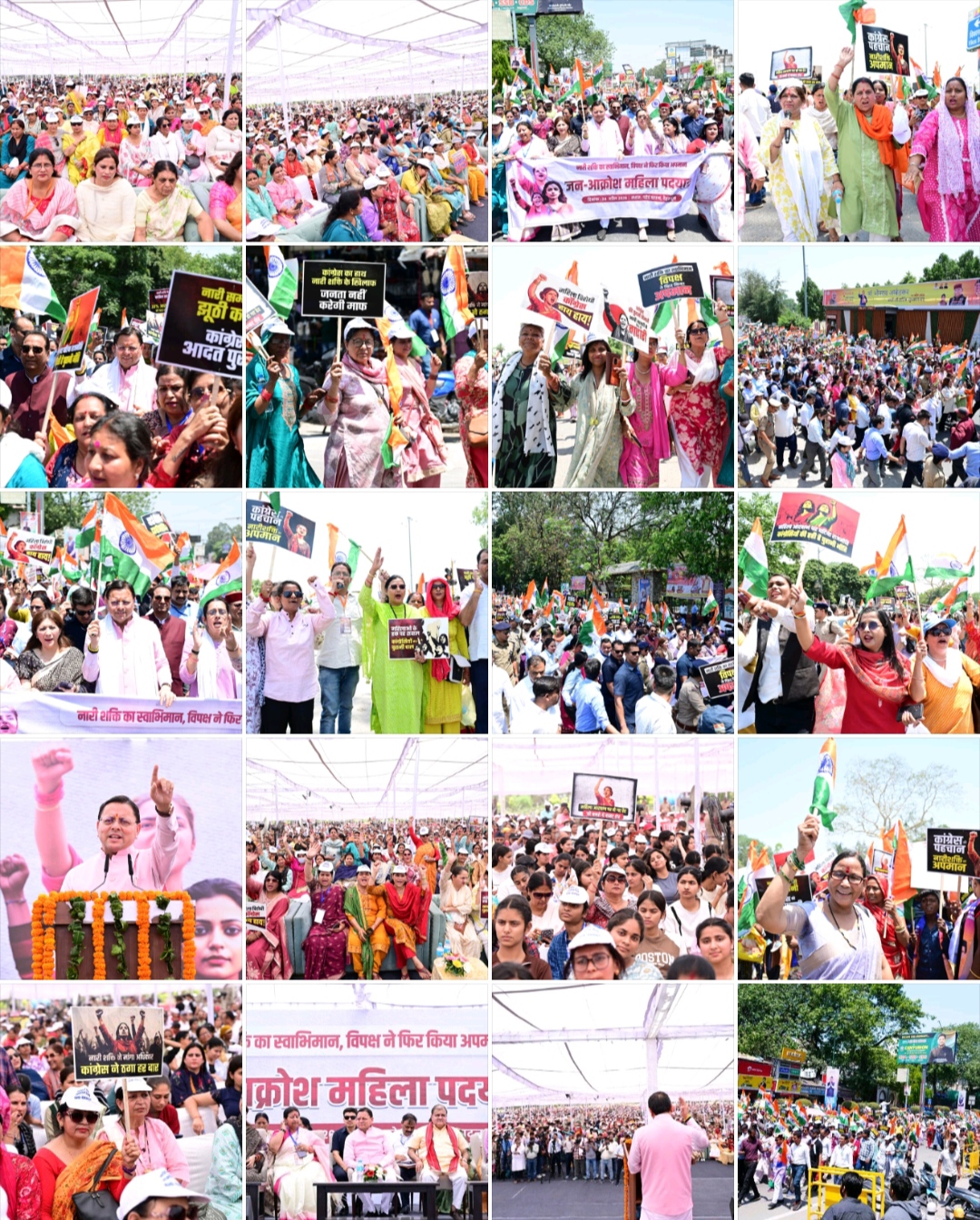 देहरादून 24 अप्रैल। मुख्यमंत्री श्री पुष्कर सिंह धामी ने शुक्रवार को परेड ग्राउण्ड, देहरादून में महिला जन आक्रोश रैली में प्रतिभाग किया। इस दौरान मुख्यमंत्री, हजारों की संख्या में मौजूद महिलाओं के साथ परेड ग्राउंड से घंटाघर तक जन आक्रोश पदयात्रा में भी शामिल हुए।
