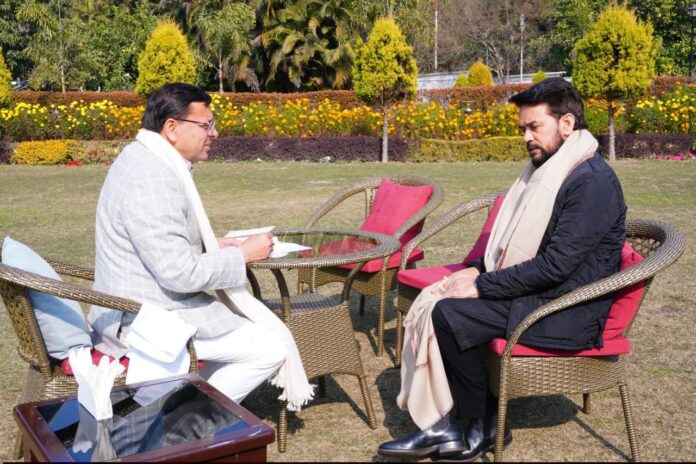 देहरादून 12 जनवरी। मुख्यमंत्री श्री पुष्कर सिंह धामी से सोमवार को मुख्यमंत्री आवास में सांसद एवं पूर्व केंद्रीय मंत्री श्री अनुराग सिंह ठाकुर ने शिष्टाचार भेंट की।