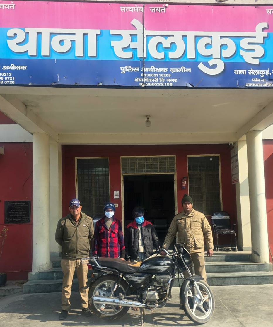घटना के अनावरण तथा अभियुक्तों की गिरफ्तारी हेतु वरिष्ठ पुलिस अधीक्षक देहरादून द्वारा थाना सेलाकुई पर गठित पुलिस टीम को आवश्यक निर्देश दिये गये। जिसके अनुपालन में पुलिस टीम द्वारा घटनास्थल के आस पास आने जाने वाले रास्तों पर लग सीसीटीवी कैमरों को चैक करते हुए घटना के सम्बंध में सुरागरसी/पतारसी करते हुए आवश्यक जानकारियां एकत्रित करते हुए मुखबिर तंत्र को भी सक्रिय किया गया। साथ ही पूर्व में वाहन चोरी में प्रकाश में आये अभियुक्तों का भौतिक सत्यापन करते हुए उनकी वर्तमान स्थिति की जानकारी करते हुए उनका भौतिक सत्यापन किया। पुलिस द्वारा किये जा रहे लगातार प्रयासों से मुखबिर की सूचना पर दिनांक 20/01/26 को चैकिंग के दौरान मुखबिर की सूचना पर धूलकोट तिराहा के पास से 02 अभियुक्तों 01: आशीष तथा 02: सुभान को उक्त घटना में चोरी की गई मोटर साइकिल के साथ गिरफ्तार किया गया।