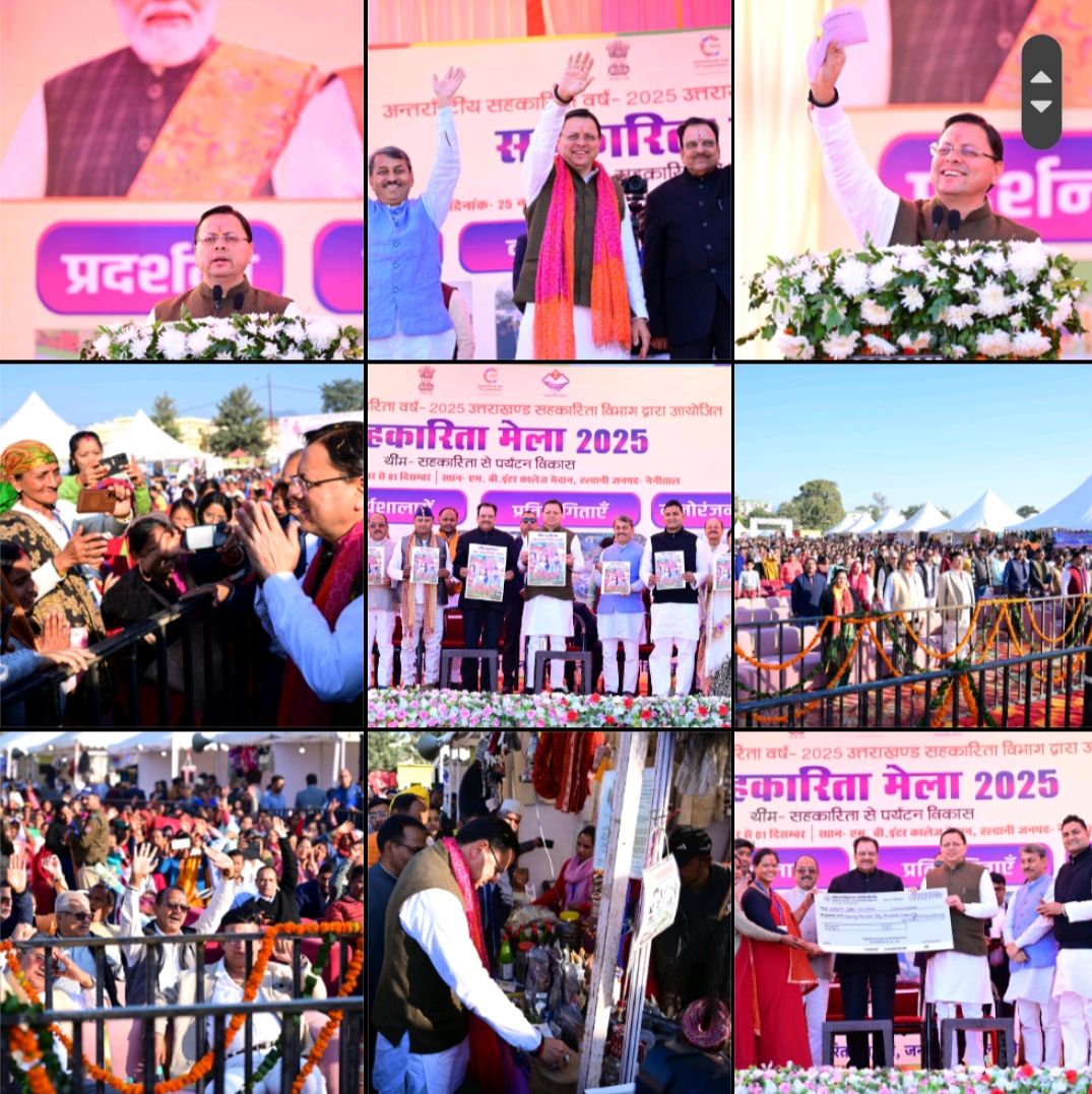 26 नवंबर। मुख्यमंत्री श्री पुष्कर सिंह धामी ने आज एम0बी0 इंटर कॉलेज, हल्द्वानी (जनपद नैनीताल) में आयोजित अंतर्राष्ट्रीय सहकारिता वर्ष–2025 के उपलक्ष्य में भव्य सहकारिता मेले में प्रतिभाग किया। इस अवसर पर मुख्यमंत्री ने प्रदेश की स्वयं सहायता समूहों और सहकारी समितियों को सशक्त बनाने की दिशा में महत्वपूर्ण कदम उठाते हुए पशुपालन एवं सब्जी उत्पादन में कार्यरत स्वयं सहायता समूह की महिलाओं को मध्यकालीन दीनदयाल उपाध्याय सहकारिता कल्याण योजना के तहत 16.97 करोड़ रुपये तथा एनआरएलएम स्वयं सहायता समूहों के अंतर्गत 75.50 लाख रुपये की वित्तीय सहायता प्रदान की। कार्यक्रम में उपस्थित जनसमुदाय ने गर्मजोशी से मुख्यमंत्री का स्वागत किया।