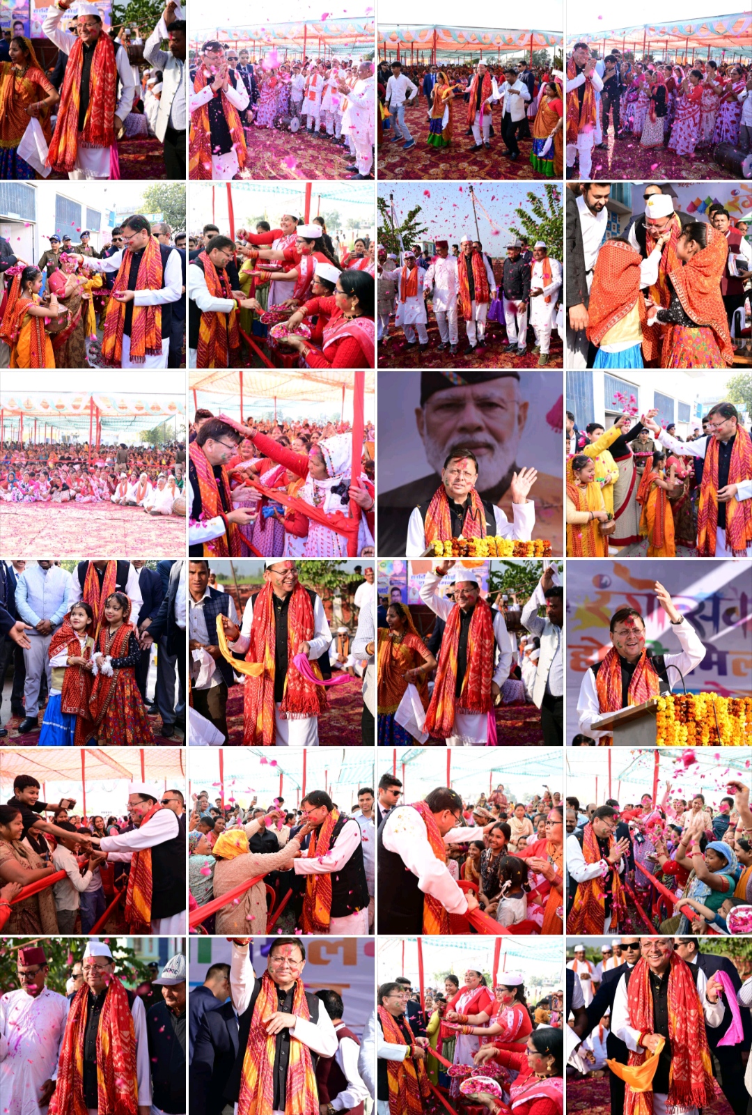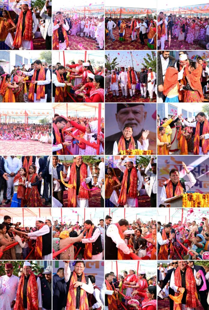 खटीमा 28 फरवरी। डिवाइन इंटरनेशनल स्कूल, दियूरी खटीमा में आयोजित होली मिलन समारोह में मुख्यमंत्री श्री पुष्कर सिंह धामी ने सहभागिता कर क्षेत्रवासियों को होली की हार्दिक शुभकामनाएं दीं। कार्यक्रम में मुख्यमंत्री ने पारंपरिक कुमाऊँनी होली, शास्त्रीय होली एवं थारू होली गायन में जनसमूह के साथ सहभागिता करते हुए रंगोत्सव की खुशियों को साझा किया। इस अवसर पर उपस्थित जनसमुदाय ने पुष्पवर्षा कर उनका भव्य स्वागत किया।